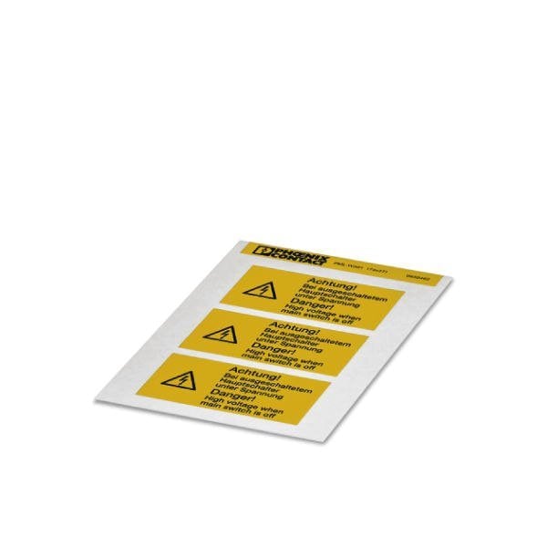 Warning label Sheet yellow/black labeled: Lightning flash and warning in German English mounting type: adhesive diameter: 0 mm lettering field size: 74 x 37 mm Number of individual labels: 3