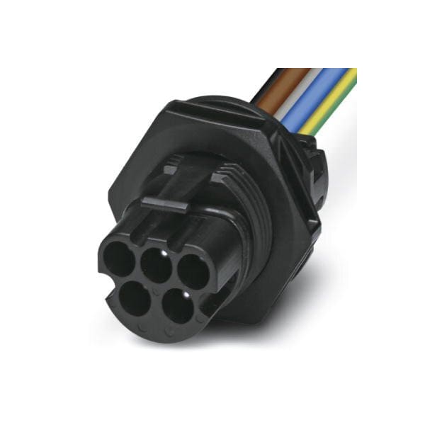 Panel feed-through Range of articles: PRC Device connector rear mounting housing material: PPE color: black number of positions: 5 max. conductor cross section: 4 mm nom. voltage: 690 V AC rated current: 32 A Connection method: Crimp connection Type of contact: P