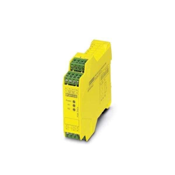 Safety relay for two-hand control devices in accordance with ISO 13851 type IIIC to SIL 3 or Cat. 4 PL e in accordance with EN ISO 13849 synchronous activation monitoring < 0.5 s 2 N/O contacts 1 N/C contact safe isolation width: 22.5 mm pluggable Push-in terminal block