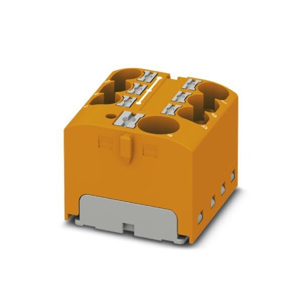 Distribution block nom. voltage: 450 V nominal current: 32 A connection method: Push-in connection Push-in connection number of connections: 7 cross section: 0.2 mm - 6 mm AWG: 24 - 10 width: 27.9 mm height: 21.7 mm color: orange mounting type: for snapping ont