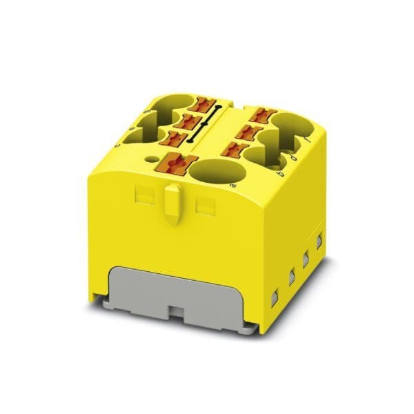 Distribution block nom. voltage: 450 V nominal current: 32 A connection method: Push-in connection Push-in connection number of connections: 7 cross section: 0.2 mm - 6 mm AWG: 24 - 10 width: 27.9 mm height: 21.7 mm color: yellow mounting type: for snapping ont