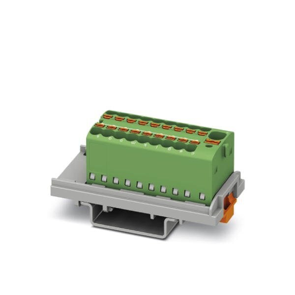 Distribution block nom. voltage: 500 V nominal current: 17.5 A connection method: Push-in connection Push-in connection number of connections: 19 cross section: 0.14 mm - 2.5 mm AWG: 26 - 14 width: 21.6 mm color: green mounting type: NS 35/7 5 NS 35/15