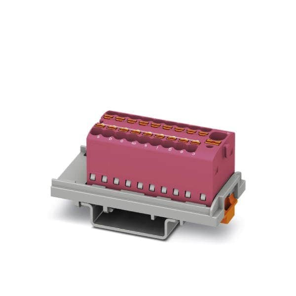Distribution block nom. voltage: 500 V nominal current: 17.5 A connection method: Push-in connection Push-in connection number of connections: 19 cross section: 0.14 mm - 2.5 mm AWG: 26 - 14 width: 21.6 mm color: pink mounting type: NS 35/7 5 NS 35/15