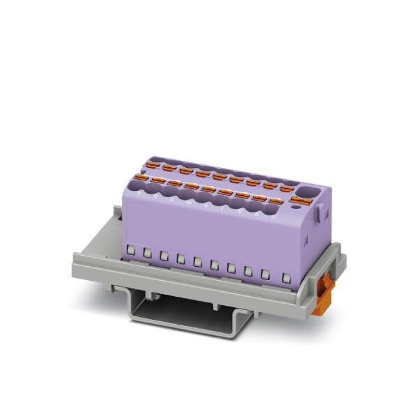 Distribution block nom. voltage: 500 V nominal current: 17.5 A connection method: Push-in connection Push-in connection number of connections: 19 cross section: 0.14 mm - 2.5 mm AWG: 26 - 14 width: 21.6 mm color: violet mounting type: NS 35/7 5 NS 35/15