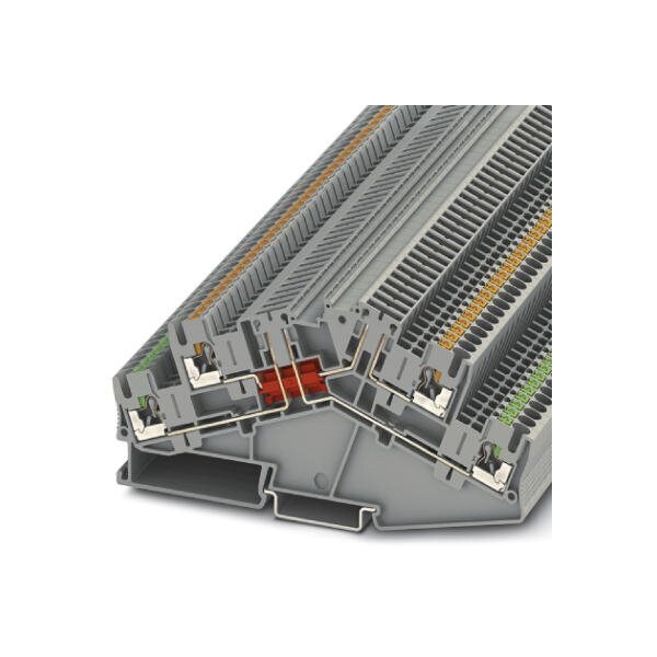 Disconnect terminal block double level with angled contour and two disconnect points Connection type: Push-in connection Cross section: 0.14 mm - 4 mm AWG: 26 - 12 Nominal current: 16 A Nominal voltage: 400 V Length: 127.5 mm Width: 5.2 mm Color: gray Assembly: NS 35/7