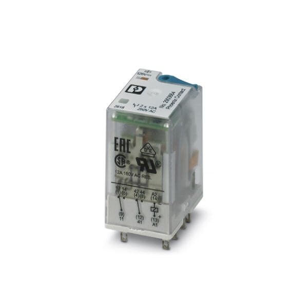 Plug-in industrial relay with power contacts 2 PDTs test button status LED freewheeling diode mechanical switch position indicator polarity: A1+ A2- input voltage: 125 V DC