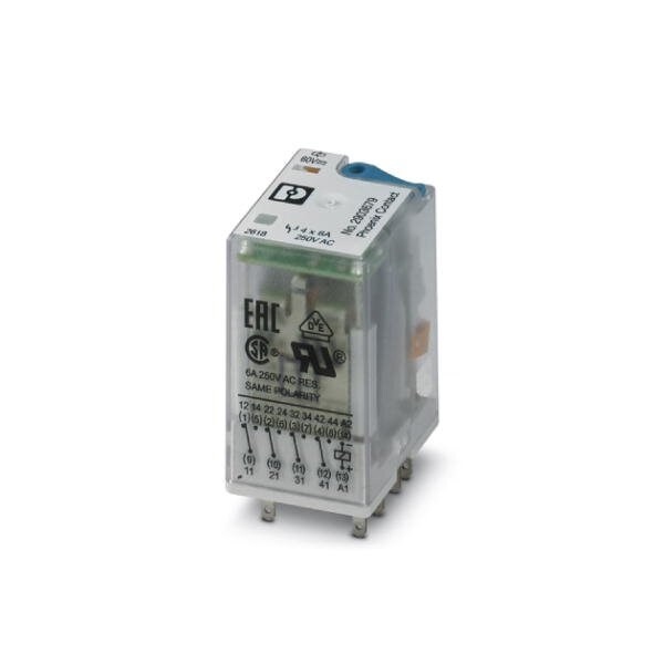 Plug-in industrial relay with power contacts 4 PDTs test key status LED freewheeling diode mechanical switch position indicator polarity: A1+ A2 coil voltage: 60 V DC