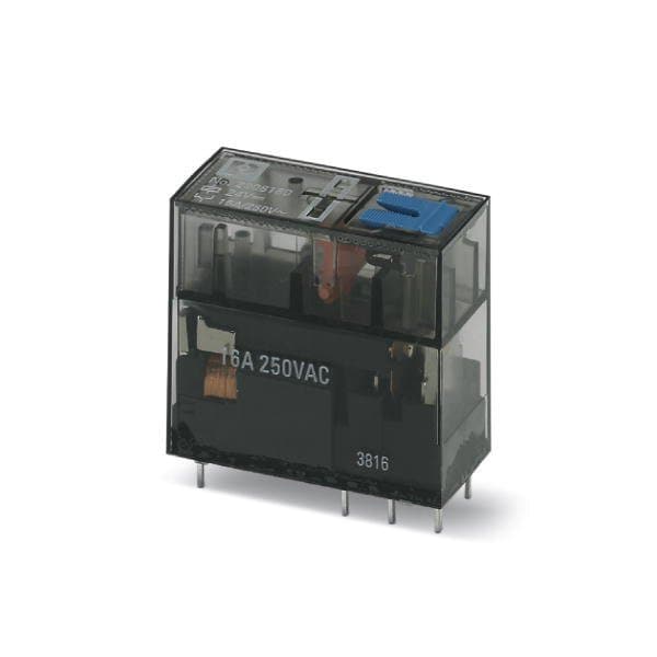 Plug-in miniature relay with power contact 1 changeover contact test button mechanical switch position indicator polarity: bipolar input voltage: 24 V DC