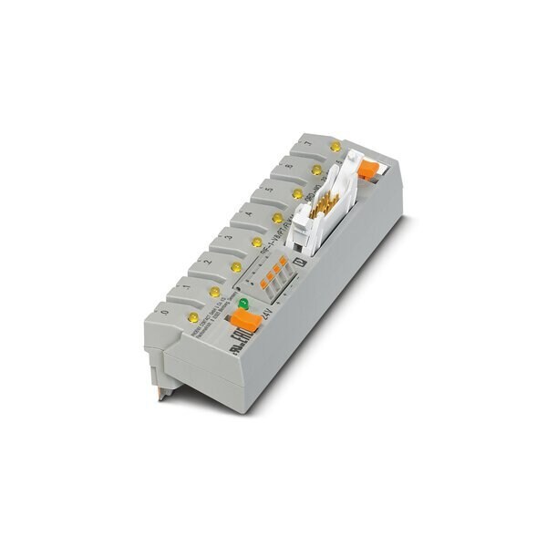 V8-OUTPUT adapter for eight RIFLINE complete RIF-1 relay bases. 14-pos. flat-ribbon cable connection for the PLC system cabling control logic: positive switching
