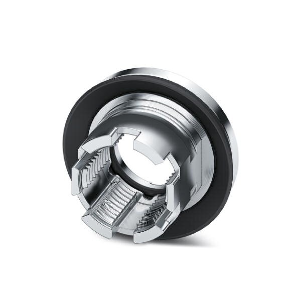 M12 threaded sleeve with tolerance-compensating function for straight SMD-solderable M12 socket contact inserts. Suitable for 2.3 mm ... 3.0 mm thick front plates.