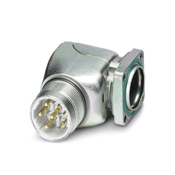 Device connector front mounting angled rotatable Screw locking M23 Number of positions: 4+3+PE Type of contact: Pin Crimp connection Axial O-ring 4x3 2 shielded: Yes Flange dimensions: 26 mm x 26 mm Compatible with mating connectors with SPEEDCON or M23 standa