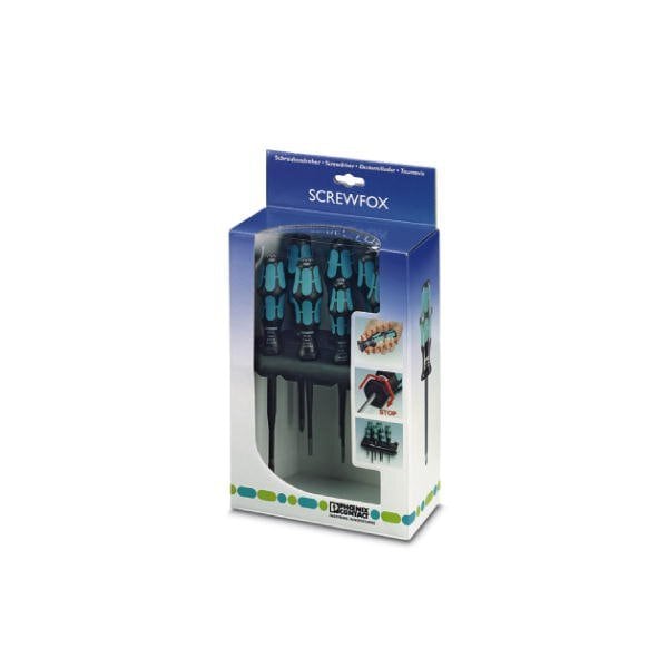 Screwdriver set protective insulation integrated in the shaft bladed/crosshead Phillips/combined profile Pozidriv + bladed plus/minus VDE-insulated 7-part incl. rack set contains the following items: 0.6 x 3.5 x 100 0.8 x 4.0 x 100 1.0 x 5.5 x 125