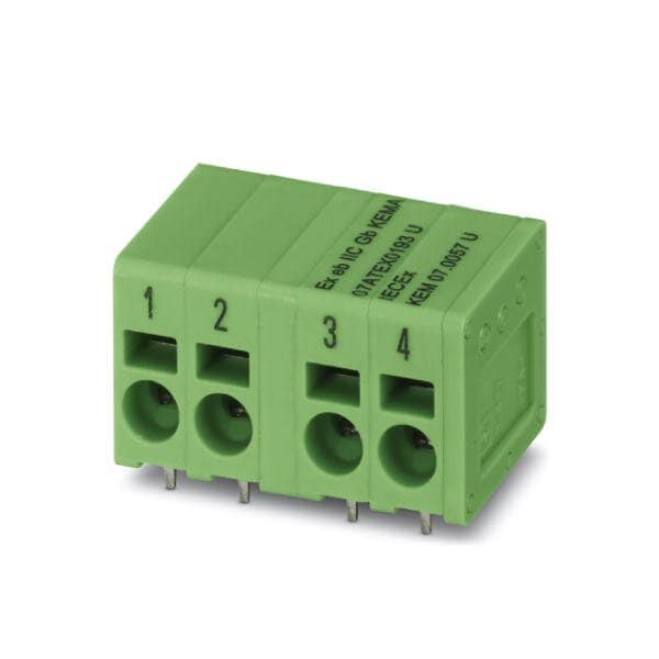 PCB terminal block nominal current: 23 A nominal cross section: 2.5 mm Number of potentials: 4 Number of rows: 1 Number of positions per row: 4 product range: SPT 2 5/..-H-EX PROFINET pitch: 5 mm connection method: Push-in spring connection mounting: Wave soldering