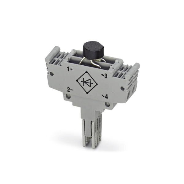 Component plug with bridge rectifier B 250 C 1500 for 4-pos. components reverse voltage: 600 V nominal voltage: 250 V nominal current: 1.5 A two basic terminal blocks are required per plug height: 19 mm color: gray
