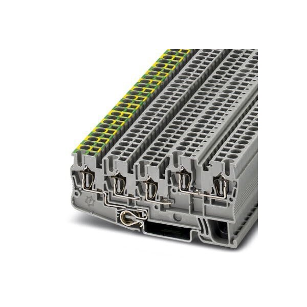 Installation ground terminal block nom. voltage: 250 V nominal current: 18 A connection method: Spring-cage connection number of connections: 5 cross section: 0.08 mm - 4 mm AWG: 28 - 12 width: 5.2 mm color: gray mounting type: NS 35/7 5 NS 35/15