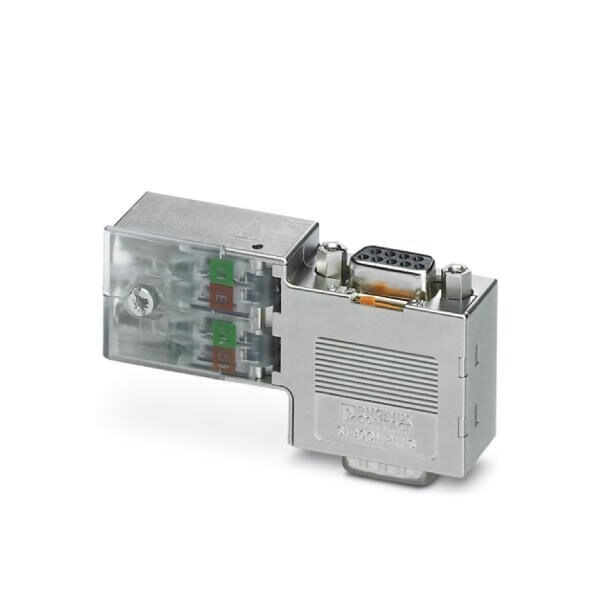 D-SUB connector 9-pos. male connector cable entry < 90° bus system: PROFIBUS DP up to 12 Mbps with PG D-SUB socket for connecting a programming device termination resistor can be switched on via slide switch pin assignment: 3 5 6 8; IDC terminal block connection
