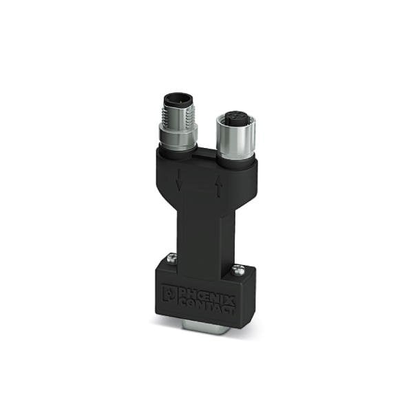 D-SUB plug 9-pos. pin assignment: 3 5 6 8; two M12 cable glands B-coded under 180° axial. Bus system: PROFIBUS DP up to 12 Mbps. Termination resistor via separate M12 terminator.