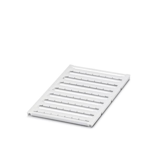 Marker for terminal blocks can be ordered: by sheet white labeled according to customer specifications mounting type: snap into flat marker groove for terminal block width: 8.2 mm lettering field size: 7.6 x 5.1 mm Number of individual labels: 56