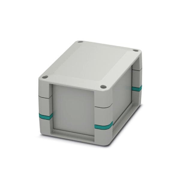 Complete housing for PCBs can be positioned flexibly; includes housing half shells side panels closed adhesive domes for PCB attachment screws for housing and PCB attachment; light gray housing with turquoise blue corner inlays