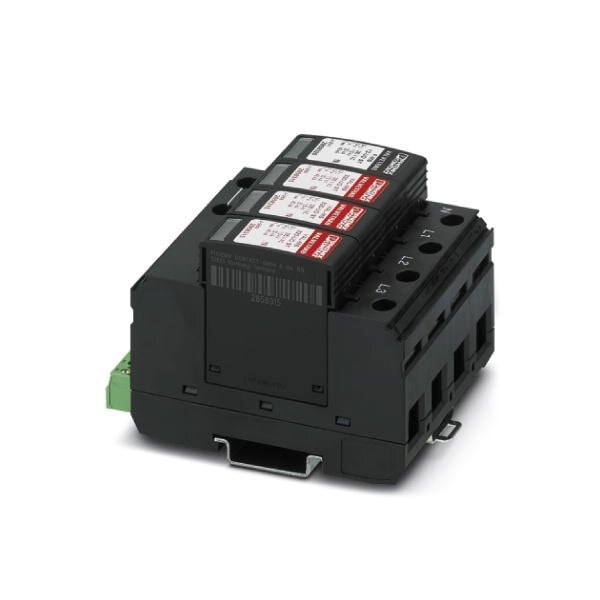 Surge voltage arrester consisting of base element with remote indicator contact and ground connectors for mounting on NS 35/7.5 nominal voltage: 320 V AC 3 + 1 circuit