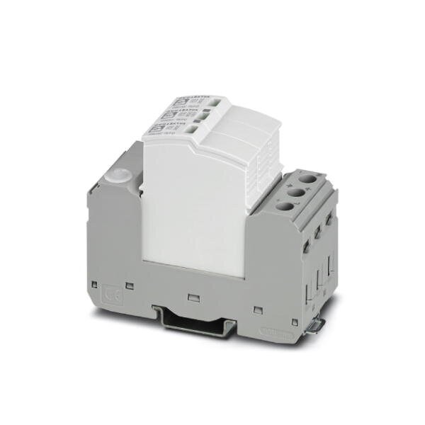 Pluggable surge protective device free of leakage current for 2-pos. isolated and grounded DC voltage systems with linear operating characteristic up to 380 V DC for DIN rail mounting 3-pos. base element with remote indication contact three pluggable temperature-monitored protective el