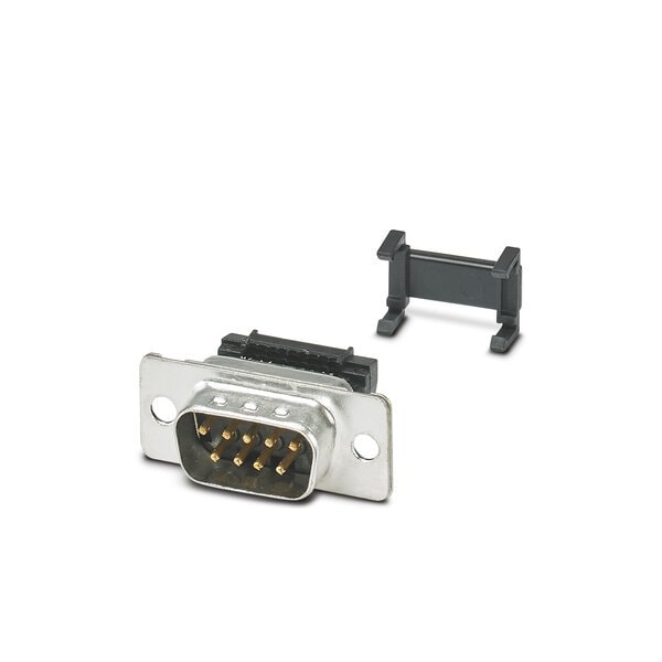 D-SUB contact insert shell size 1 with nine signal contacts type of contact pin flat-ribbon cable connection angled fixing with a 3 mm hole for panel mounting frame VS-09-...