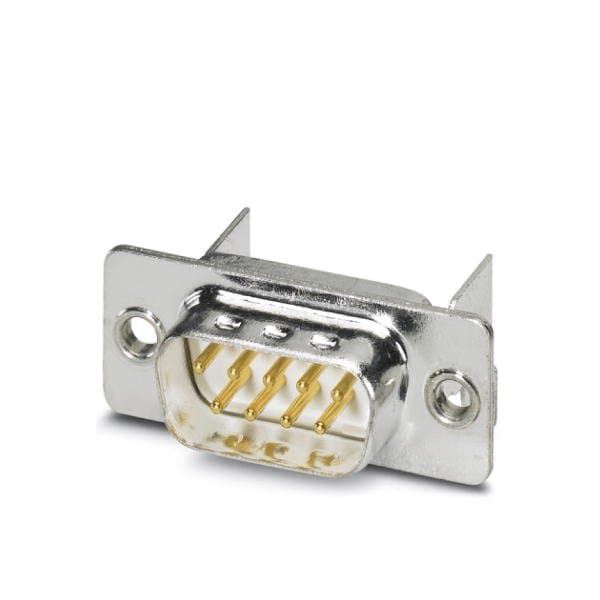 D-SUB contact insert shell size 1 with nine signal contacts type of contact pin for PCB assembly angled fixing with a 2.5 mm hole and solder metal plate for panel mounting frame VS-09-...