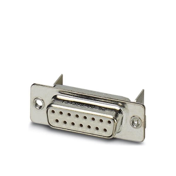 D-SUB contact insert shell size 2 with 15 signal contacts type of contact socket for PCB assembly angled fixing with a 2.5 mm hole and solder metal plate for panel mounting frame VS-15-...
