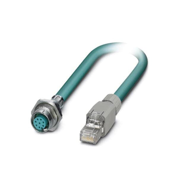Assembled Ethernet cable shielded 4-pair AWG 26 suitable for use with drag chain 19-wire RAL 5021 sea blue M12 flush-type socket rear wall/screw mounting with M16 thread on RJ45 connector/IP20 line length 1 m