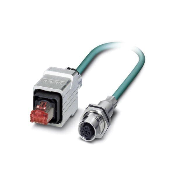 Assembled Ethernet cable CAT5e shielded 2-pair AWG 26 stranded 7-wire RAL 5021 water blue M12 flush-type socket rear/screw mounting with M16 thread on RJ45 plug/IP67 push-pull metal housing line length 2 m
