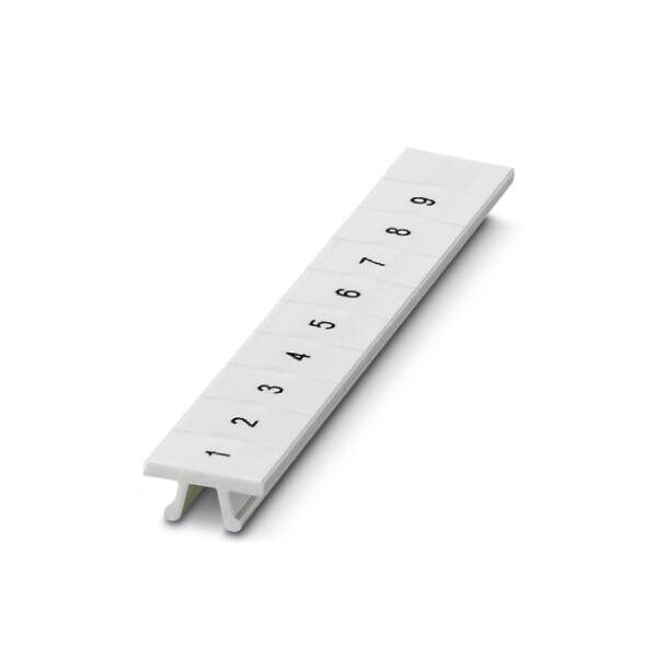Marker for terminal blocks Strip white labeled printed horizontally: consecutive numbers 1 ... 9 mounting type: snap into tall marker groove for terminal block width: 6.2 mm lettering field size: 10.5 x 6.15 mm Number of individual labels: 9