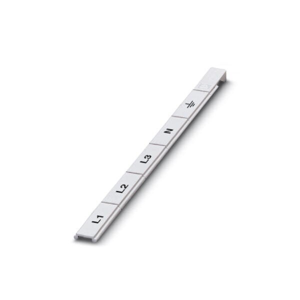 Marker for terminal blocks Strip white labeled horizontal: L1 L2 L3 N GND mounting type: snap into tall marker groove for terminal block width: 18 mm lettering field size: 18 x 5 mm Number of individual labels: 5