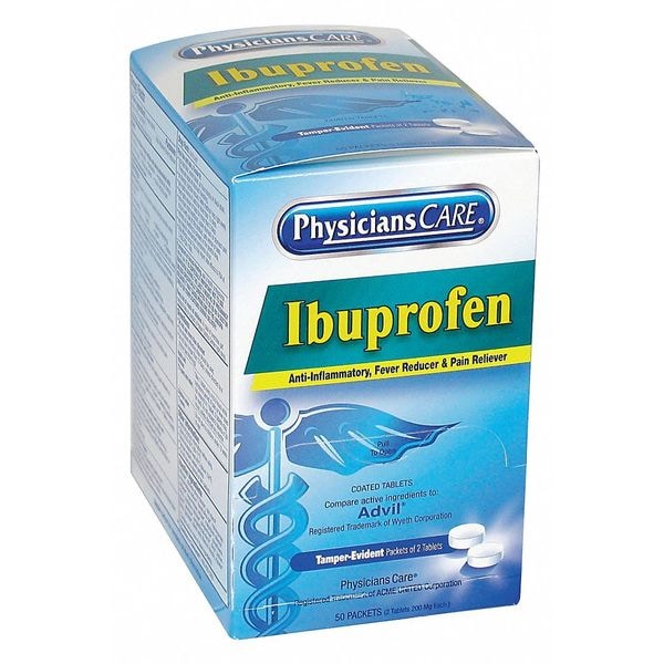Pain Relief, Active Ingredient Ibuprofen, Dose Package Type Packets, Unit Dose 200 mg, Number of Individual Doses 50, Format Tablet, Exterior Package Type Box, Compatible Manufacturer Part Number 54606, 54627, 54628, 59330, Strength Regular Strength, Flavor Unflavored, Purpose Pain Relief, Unit Count 100, Compatible Grainger Part Number 22FX71, 463L94, Package Height 3 1/2 in, Package Length 4 1/4 in, Package Width 2 1/2 in, Package Quantity 50