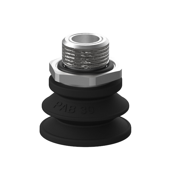 Item Vacuum Pad Assembly, Durometer 60A, Includes Filter Mesh, Maximum Operating Temperature 194 Degrees F, Minimum Operating Temperature 32 Degrees F, Number of Pieces 5, Outside Diameter 30 mm, Pad Color Black, Pad Diameter 30 mm, Pad Material Nitrile/PVC, Pad Type Bellows, Port Size 3/8 in, Port Type G, Series PAB, Package Quantity 5