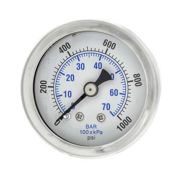 Industrial Pressure Gauge, Nominal Dial Size 1 1/2 in, Accuracy +/-3-2-3 Percent, Gauge Case Material Stainless Steel, Process Connection Type NPT, Process Connection Gender Male, Lens Material Polycarbonate, Process Connection Size 1/8 in, Field Fillable No, Process Connection Location Center Back, Case Color Metallic, IP/NEMA Rating Not Rated, Primary Pressure Range 0 to 1,000, Dry Dampening Feature None, Vibration Resistance Liquid-Filled, Dial Color White