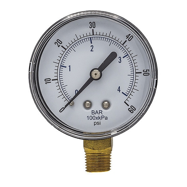 Industrial Pressure Gauge, 0 to 60 psi, 2 1/2 in Dial, 1/4 in BSPT, Bottom Location
