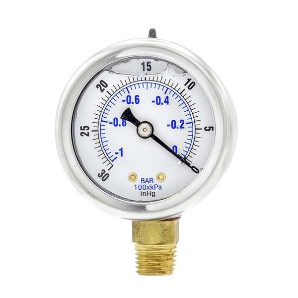 Industrial Vacuum Gauge, Nominal Dial Size 2 in, Accuracy +/-3-2-3 Percent, Gauge Case Material Stainless Steel, Process Connection Type NPT, Process Connection Gender Male, Lens Material Polycarbonate, Process Connection Size 1/4 in, Field Fillable No, Process Connection Location Bottom, Case Color Metallic, IP/NEMA Rating Not Rated, Primary Pressure Range -30 to 0, Dry Dampening Feature None, Vibration Resistance Liquid-Filled, Dial Color White, Pressure Gauge Type Industrial Pressure Gauge