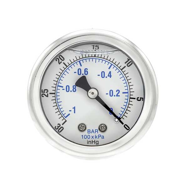 Industrial Vacuum Gauge, Nominal Dial Size 2 in, Accuracy +/-3-2-3 Percent, Gauge Case Material Stainless Steel, Process Connection Type NPT, Process Connection Gender Male, Lens Material Polycarbonate, Process Connection Size 1/8 in, Field Fillable No, Process Connection Location Center Back, Case Color Metallic, IP/NEMA Rating Not Rated, Primary Pressure Range 30 to 0, Dry Dampening Feature None, Vibration Resistance Liquid-Filled, Dial Color White