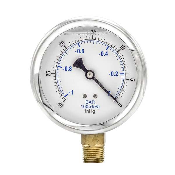 Industrial Vacuum Gauge, Nominal Dial Size 4 in, Accuracy +/-1.0 Percent, Gauge Case Material Stainless Steel, Process Connection Type NPT, Process Connection Gender Male, Lens Material Polycarbonate, Process Connection Size 1/2 in, Field Fillable No, Process Connection Location Bottom, Case Color Metallic, IP/NEMA Rating Not Rated, Primary Pressure Range 30 to 0, Dry Dampening Feature None, Vibration Resistance Liquid-Filled, Dial Color White, Pressure Gauge Type Industrial Pressure Gauge