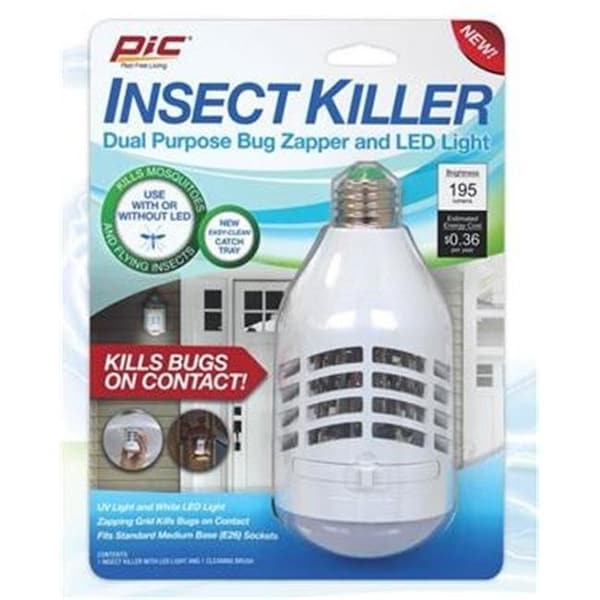 Dual purpose bug zapper and LED light kills bugs on contact. Two lighting functions designed to attract and kill a wide range of flying insects. Fits into a medium base.Pic Insect Killer Bulb With Catch Tray.