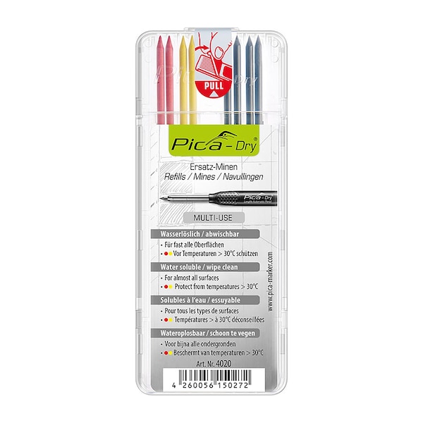 Set of 8 Pre-sharpened Multi-Use, Water soluble Refill Leads in colors 4 Graphite, 2 Red, 2 Yellow for your Pica Dry Automatic pencil. These leads are for use on almost all surfaces including dry, wet, glossy, rough, dusty, oily and more. On glossy surfaces marks can be wiped clean with a damp cloth. Protect red & yellow leads from temperatures over 86 DegF.