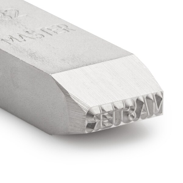 The stamp features the word "MASTER" engraved in durable steel, with each letter designed to leave a clear, readable imprint. It is made from a special carbon steel that is chemically nickel-plated to add protection from rust and ensure long-lasting performance. The stamp is also engraved using CNC technology, which ensures that each letter is of invariable depth and is precise and consistent.