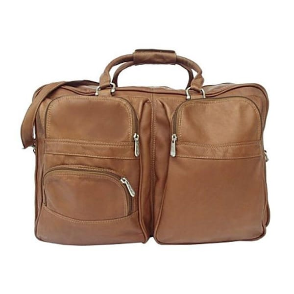 Top-zip opening to roomy main compartment. Rear zip compartment with elastic straps to secure clothing and interior zip-pocket zips down completely for easy access. Three half-moon zip-pockets in front double handles and an adjustable/detachable shoulder strap. -19.5 x 12 x 7