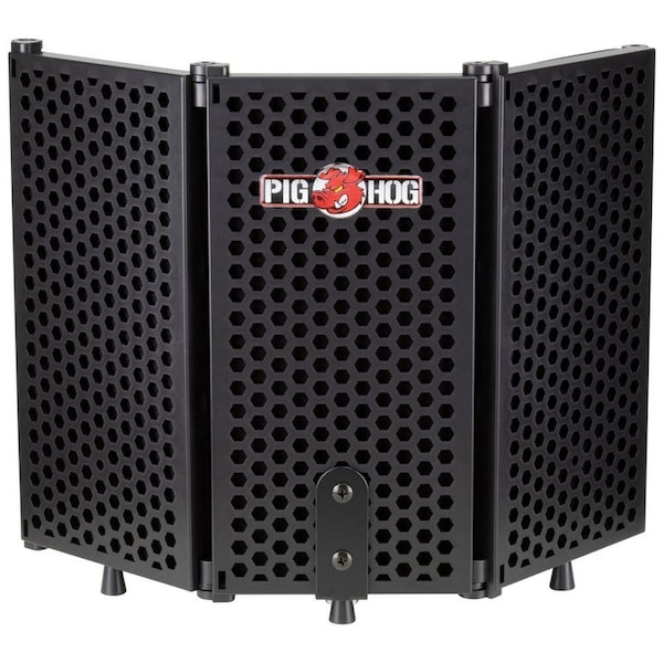 The Pig Hog microphone isolation shield is the perfect portable sound booth. The three porous plastic panels provide an initial layer of sound reflection protection to reduce sonic coloration. The panel cases are filled with strategically shaped, extra fat, high-density foam to eliminate remaining sonic interference. The three panels can be folded for easy storage and transport and can be set at any angle to provide optimal sound isolation. The versatile, free-standing shield can be placed directly onto a flat surface or mounted to a microphone stand. Backed by a lifetime guarantee, the Pig Hog Microphone Isolation Shield provides the perfect portable, protective barrier for sound recording. -Extra fat, high density, sound isolating foam panels. -Can be placed directly on a flat surface, or mounted to a microphone stand. -Hinged three-panel design can be adjusted for optimal sound isolation or storage. -47 cm wide x 32 cm tall x 16 cm deep when flat each panel measures 15 cm wide x 30 cm tall x 4.5 cm deep -Limited lifetime guarantee.