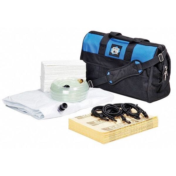 5 ft L x 5 ft W Leak Diverter, 25 ft L Drainage Hose, (4) 19 in L Adjustable Hanging Straps, 30 Pack Yellow Printed Message inCAUTION in PIG(R) Mat, (2) 25 Pack 1/4 Fold PIG(R) All-Purpose Wipers In A Poly Bag, 24 in L x 10 in W x 12 in H Nylon Carrying Bag