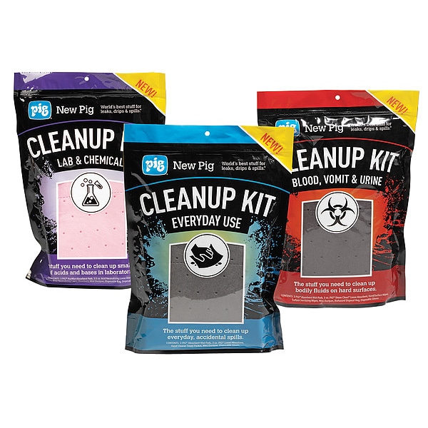 Spill Kit, Fluids Absorbed Universal, Neutralizes Chemical Type Acids, Bases, Volume Absorbed Per Kit 100 oz, Container Type Bag, Not Applicable Container Capacity, 4 in W x 9 1/4 in L x 13 in H Container Size, Blue, Purple, Red, Filled