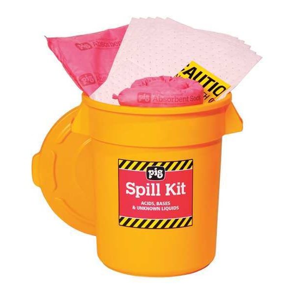 Spill Kit, Fluids Absorbed Acids, Bases, For Use With Chemical or Metal Type Acids, Bases, Neutralizes Chemical Type Not Applicable, Volume Absorbed Per Kit 11 gal, Container Type Can, 20 gal Container Capacity, 19 in W x 19 in L x 23 in H Container Size, Yellow, Filled, Sorbents Included (5) PIG(R) Harsh Chemical Absorbent Pillow (16 in L x 17 in W x 2 in H) (HR7015), (6) PIG(R) Harsh Chemical Absorbent Mat Pad (20 in L x 15 in W) (MAT301), (6) PIG(R) Absorbent Sock (46 in L x 3 in Dia) (124CR)