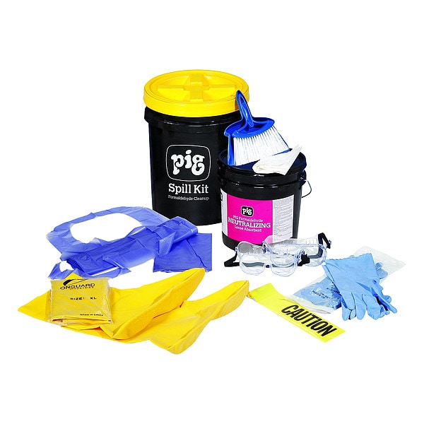 Spill Kit, Fluids Absorbed Formaldehyde, For Use With Chemical or Metal Type Formaldehyde, Specialized Applications Formaldehyde, Neutralizes Chemical Type Formaldehyde, Volume Absorbed Per Kit 2 gal, Container Type Bucket, 5 gal Container Capacity, 12 in W x 12 in L x 15 in H Container Size, Black, Filled, Sorbents Included Formaldehyde Loose Absorbent (11 lb), PPE Included (2) Aprons, (2) Pairs Goggles, (2) Pairs Boot Covers, (2) Pairs Gloves