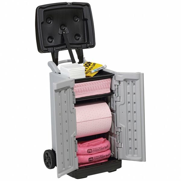 Spill Kit, Fluids Absorbed Acids, Bases, Neutralizes Chemical Type Not Applicable, Volume Absorbed Per Kit 20 gal, Container Type Cart, 20 gal Container Capacity, 24.11 in x 23.5 in x 38.25 in Container Size, Gray, Filled, Sorbents Included (1) Absorbent Mat Roll (15 in H x 11.5 in dia x 90 ft L), (45) PIG(R) Chemical Absorbent Mat Pads (15 in L x 10 in W), (5) PIG(R) Chemical Absorbent Socks (46 in L x 3 in D)