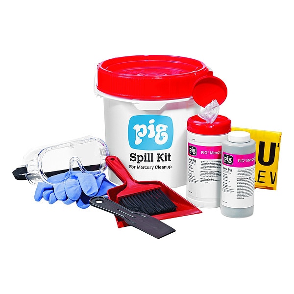 Spill Kit, Fluids Absorbed Heavy Metals, For Use With Chemical or Metal Type Mercury, Specialized Applications Mercury, Neutralizes Chemical Type Mercury, Volume Absorbed Per Kit 35 oz, Container Type Bucket, 3 1/2 gal Container Capacity, 8 3/4 in W x 8 3/4 in L x 8.125 in H Container Size, White, Filled, Sorbents Included (1) PIG(R) Mercury Cleanup Wipers (8 1/2 in W x 9 in L) (WIP1404), (1) PIG(R) Mercury Absorbent Powder (PLP602), PPE Included (1) Pair Gloves, (1) Pair Goggles